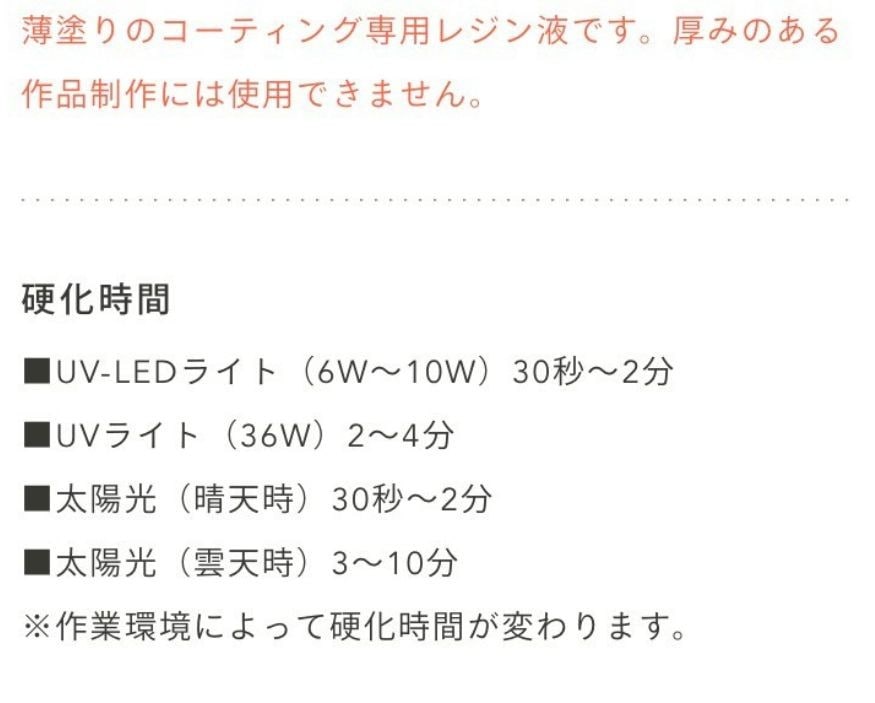コーティング専用レジン液。硬化が早く、硬い仕上がりで、硬化後のベタつきがない。