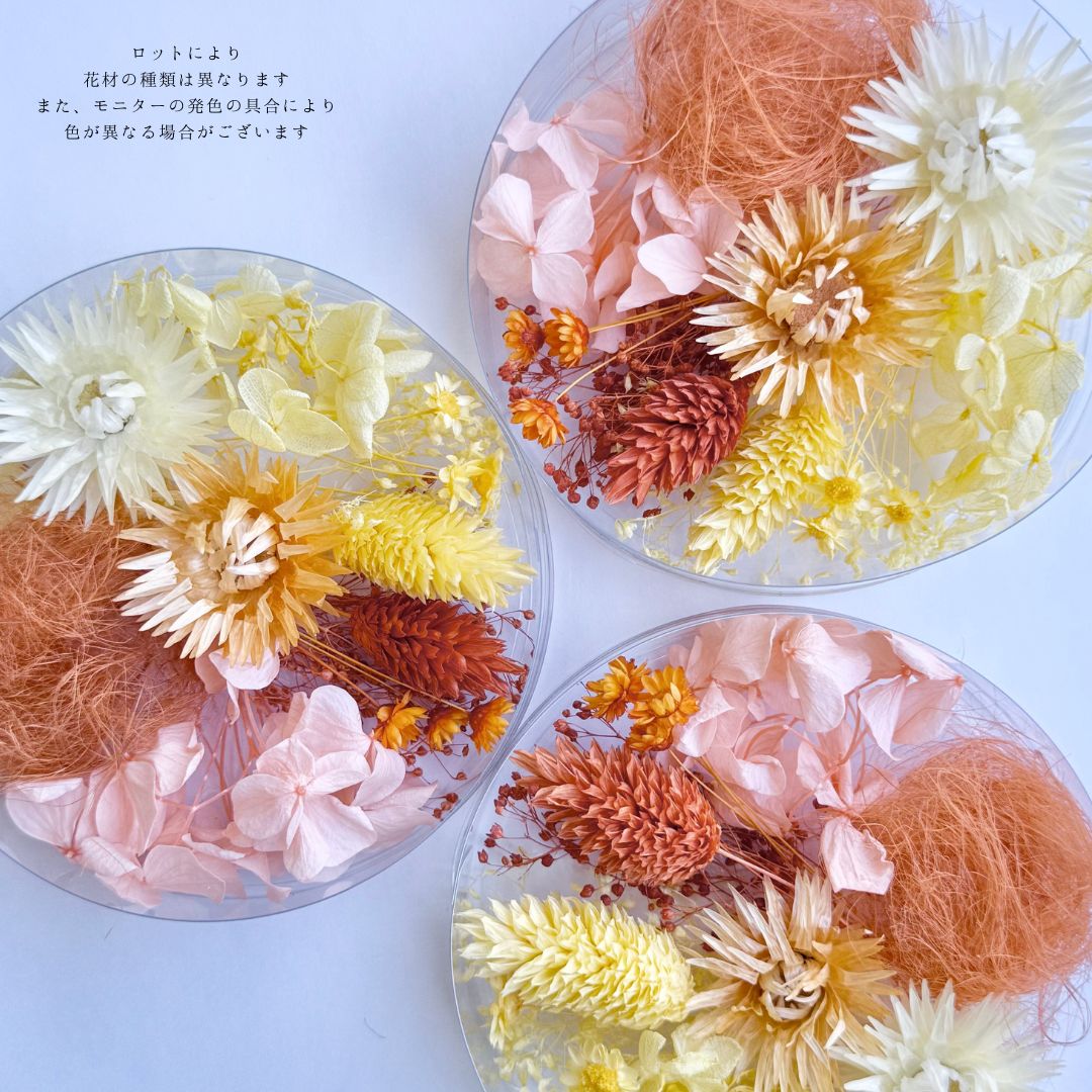 花材パックは、2色のプリザーブド、ドライフラワー等が100x25mmの容器に入っています。